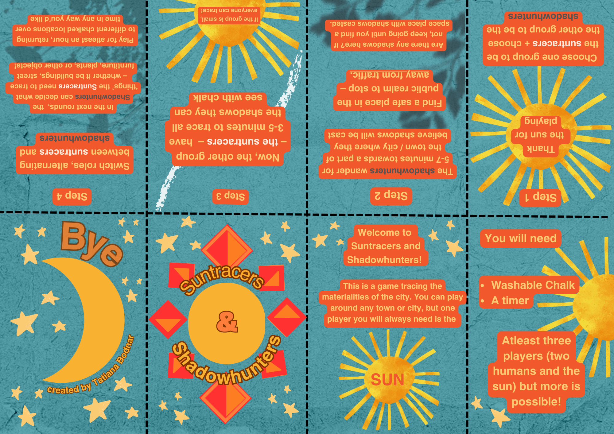 A new materialist game and zine I prototyped as part of the Posthuman Summer Lab hosted at RMIT in Melbourne in Feb 2025, with Professor Rosi Braidotti, and played as part of the Swansea Arts Weekend. Participants follow the sun and trace shadows of different types of materiality with chalk, creating a fleeting snapshot of the city